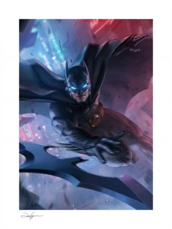 Batman stürmt nach vorne, sein Batarang zerschmettert das zerbrochene Glas vor ihm. Blaue Lichter flackern in seiner Hightech-Kutte auf, analysieren seine Gegner und bereiten den Dunklen Ritter auf das vor, was er als Nächstes tun muss. Das Neonlicht von Gotham City lässt seine Muskeln aufleuchten, während Batmans wallender Umhang ihn in Schatten hüllt. Der Künstler Jeehyung Lee nutzt den fließenden Stoff zusammen mit der charakteristischen Krümmung des Batarangs, um eine Komposition zu schaffen, die das Auge des Betrachters immer wieder in den Rahmen zurückkehren lässt und ihn in Batmans intensiven Blick einschließt.